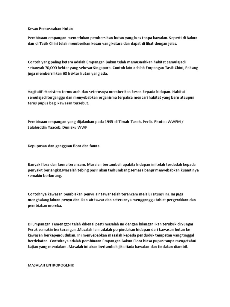 Aktiviti-aktiviti ini akan memusnahkan sesuatu habitat dan spesies haiwan dalam sesuatu jangka masa tertentu. Planet mendahului keuntungan Hanya satu Bumi. Kemusnahan Dan Perubahan Habitat.