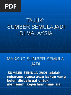 SUMBER SEMULAJADI DI MALAYSIA MAKSUD SUMBER SEMULA JADI SUMBER SEMULA JADI adalah sebarang punca atau bahan yang boleh diubahsuai untuk memenuhi keperluan manusia. Potensi sumber semula jadi termasuk sumber tanah. Satu contoh yang sangat penting ialah hidrokarbon kerana terdapat rizab terhad ini.