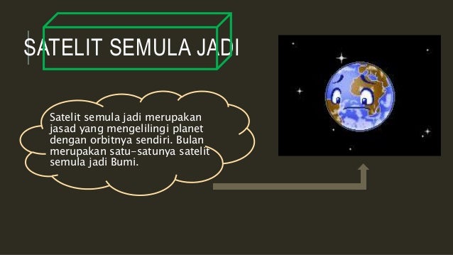 Bulan digelar sebagai satelit bumi kerana ia mengelilingi atau mengorbit bumi secara semula jadi. SATELIT SEMULA JADI Satelit semula jadi merupakan jasad yang mengelilingi planet dengan orbitnya sendiri. A 365 14 hari b 27 13 hari c 24 jam 6 ketika bumi berada di antara bulan dan matahari orang di bumi akan melihat bulan dalam fasa.